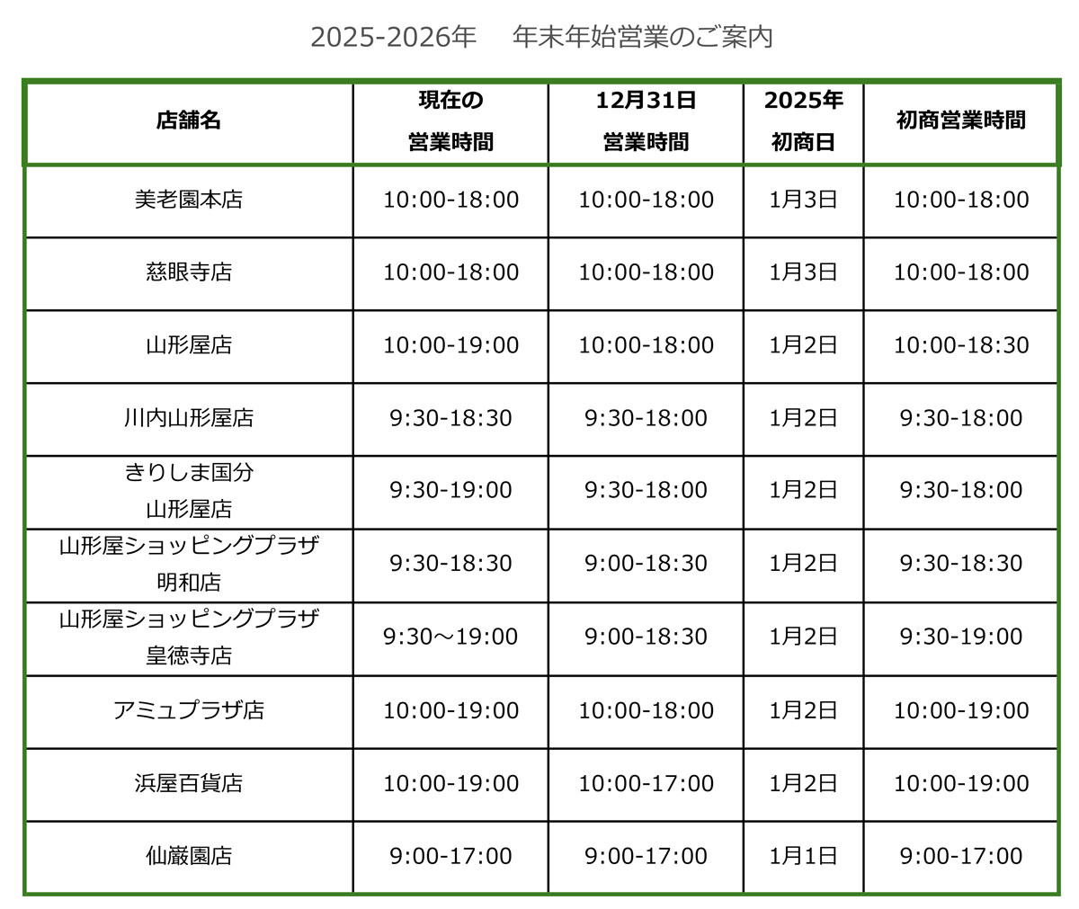 美老園本店、慈眼寺、川内山形屋店、きりしま国分山形屋店、山形屋ショッピングプラザ明和店、