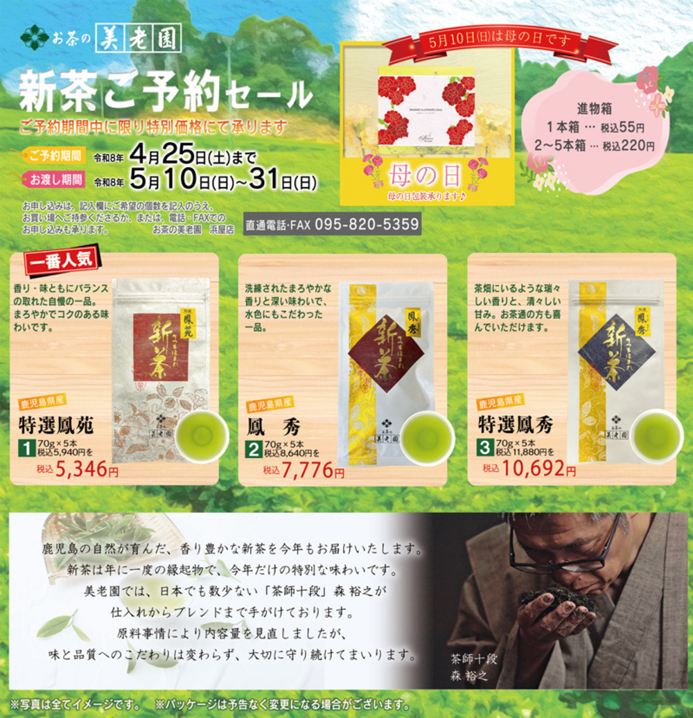 お茶の美老園各店では、2026年の新茶のご予約を期間中特別価格にて好評承り中です。